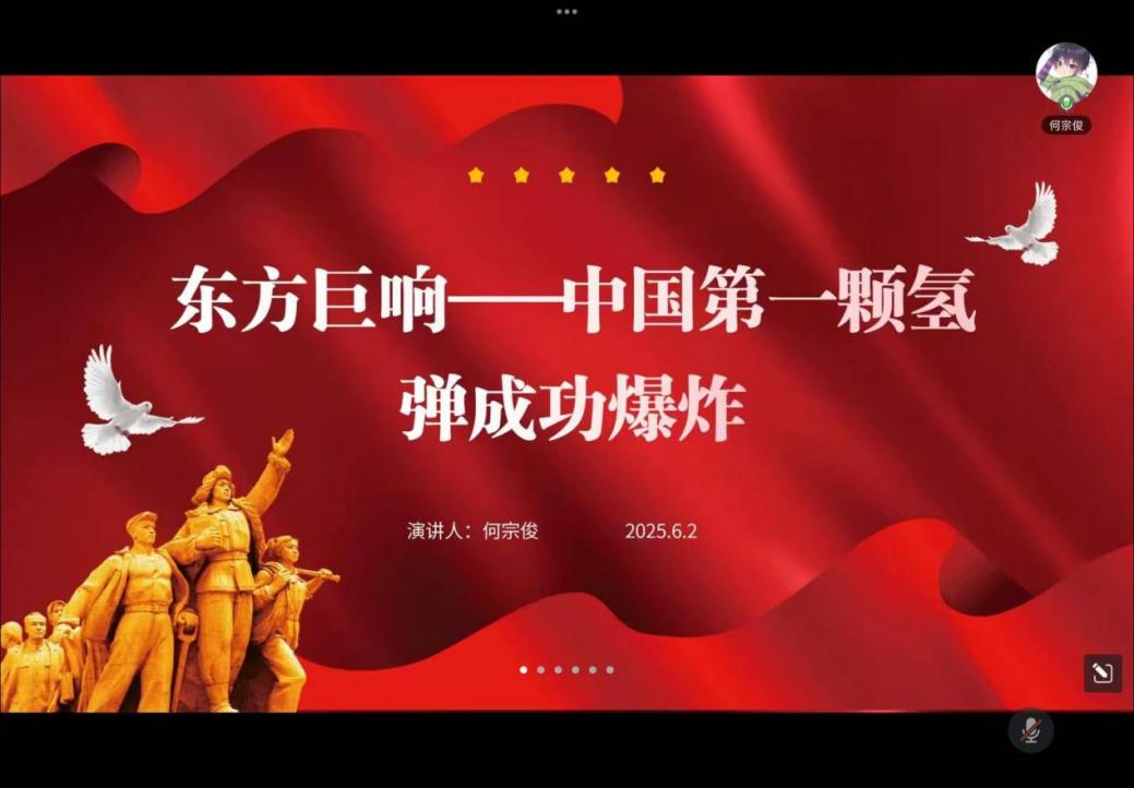 在“红途轮忆,青讲党史”环节,首先由娄卓凡小组分享了第一颗氢弹成功爆炸的历程,分析做出这一重大决策的历史背景,最后提到“两弹一星”精神激励着后人,让同学们深深触动。