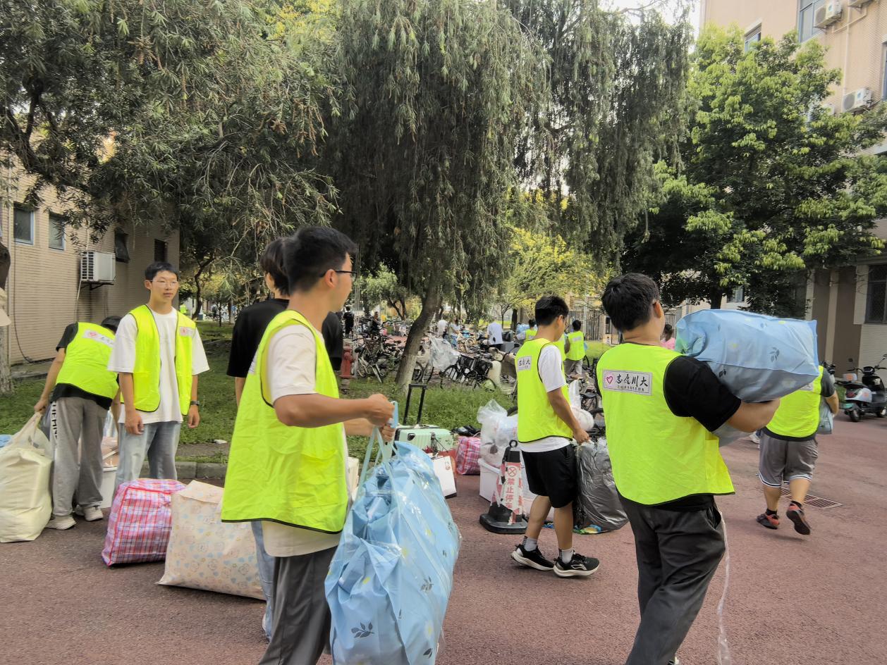 2024级的志愿者们穿梭于楼宇与校车停靠点之间,为2023级学长学姐的跨校区寝室搬迁工作提供了暖心助力。