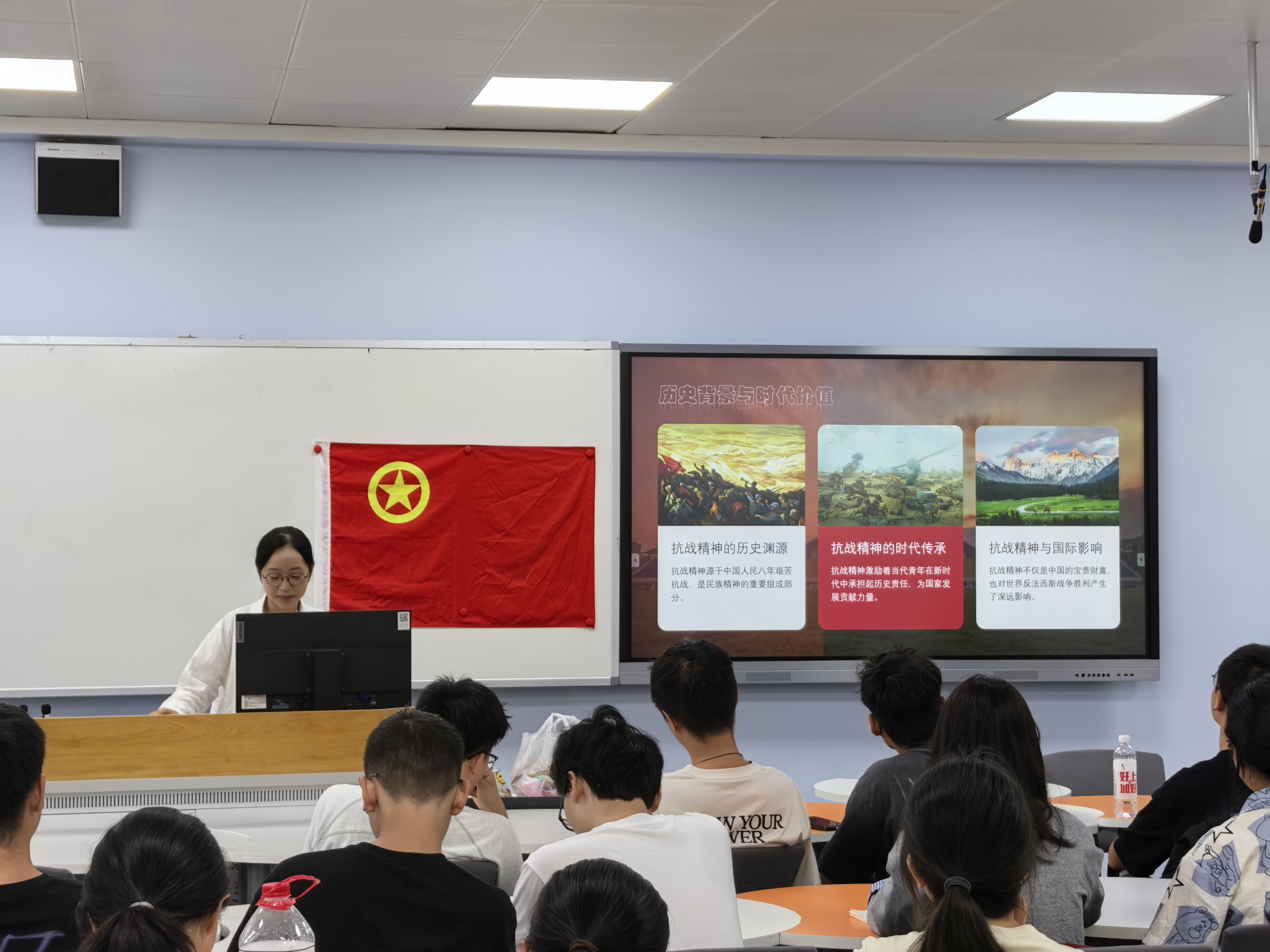 活动伊始,全体团员齐唱共青团团歌,拉开活动序幕。接着,团支部书记韩欣怡讲解抗战精神的历史渊源、时代传承、国际影响,深化团员们对抗战重要性的认识。