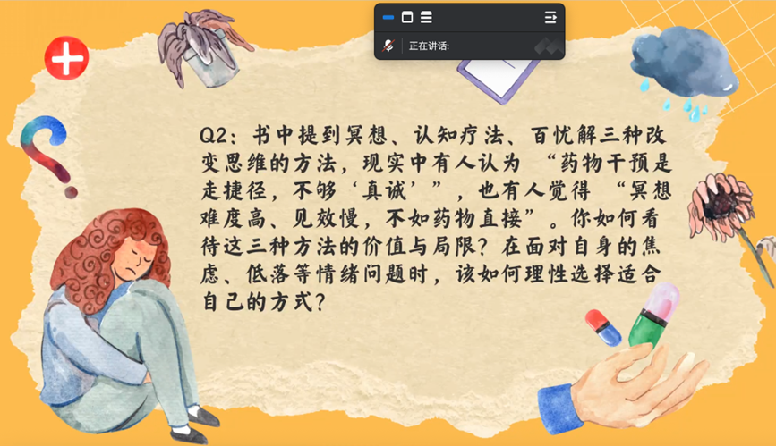 互动环节围绕“冥想、认知疗法与药物干预的价值与局限”展开讨论。成员一致认为,冥想需长期坚持,对紧急情绪问题效果有限;认知疗法依赖个体的反思与学习能力;药物干预存在副作用,且难以根除认知问题。大家认识到,选择情绪调节方式应结合问题的严重程度、紧急程度及个人实际情况综合考虑。