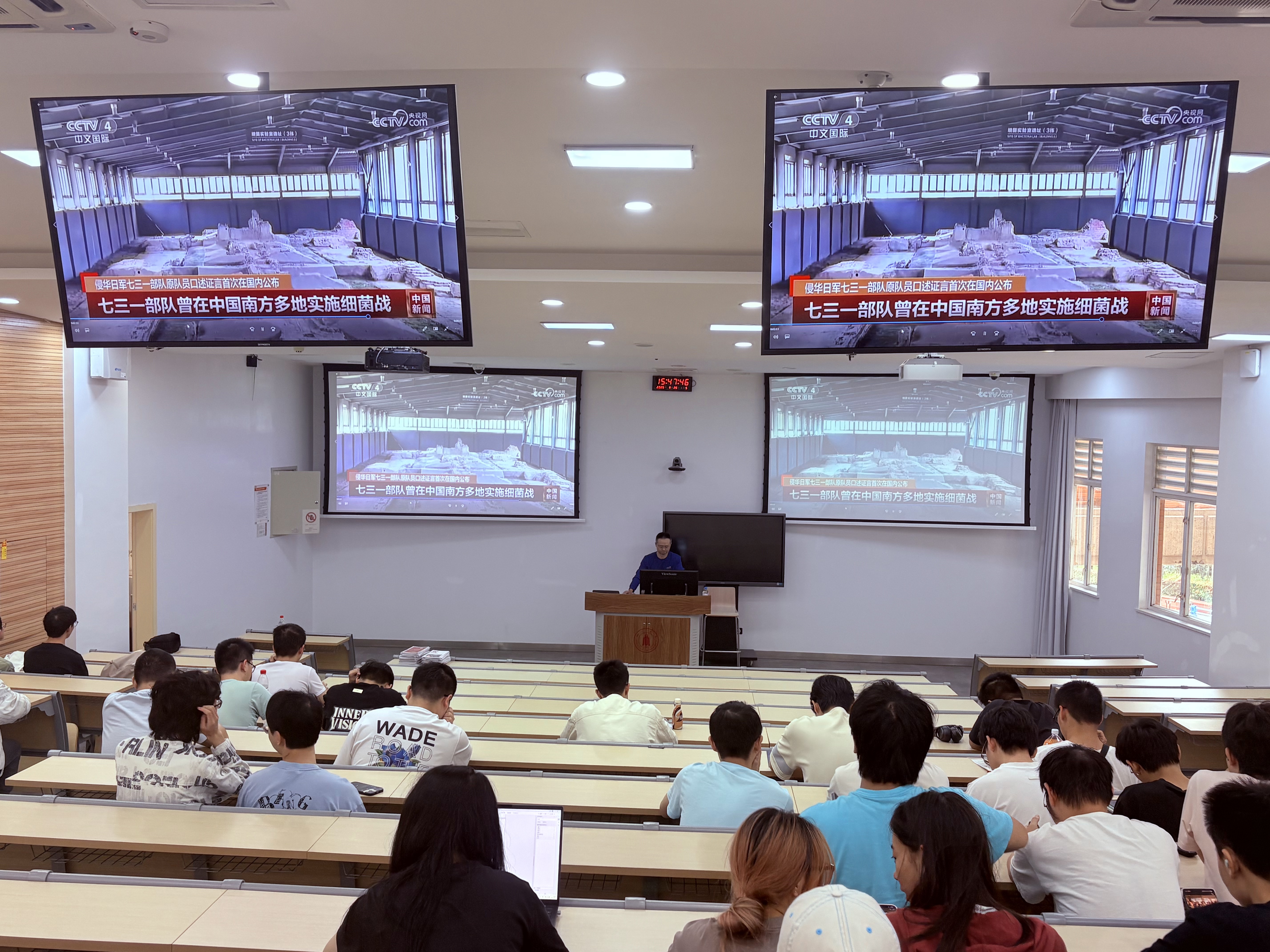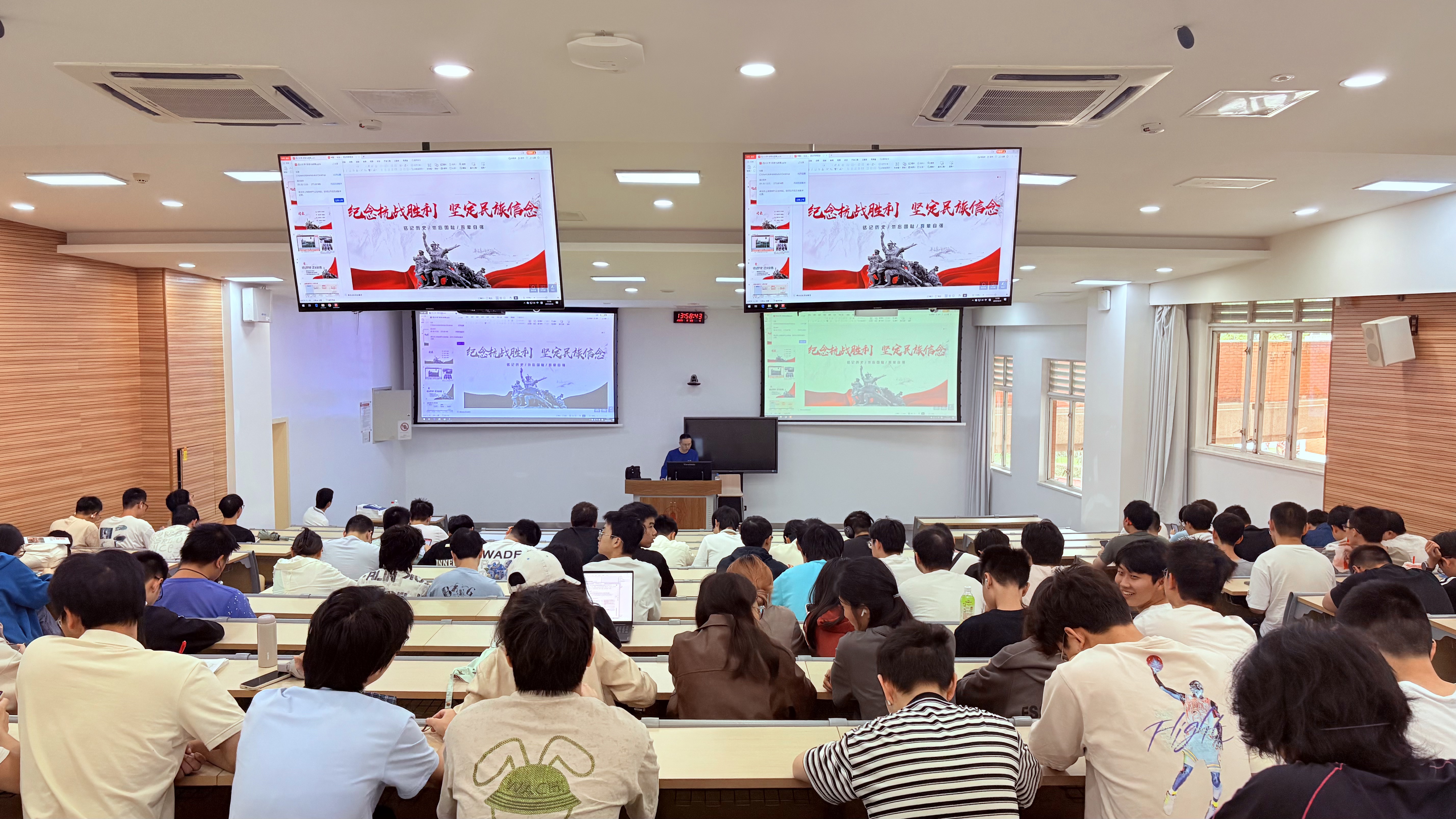 22本通信工程和光电信息科学与技术专业,迎来了秋季第一次形教课,谢老师以《纪念抗战胜利,坚定民族信念》为主题开展专题授课。课程开篇,谢老师通过播放抗战历史纪录片片段、展示珍贵历史图片,让同学们直观感受抗日战争的艰辛历程与伟大胜利。然后,谢老师从 “抗战历史的重要节点”“抗战精神的核心内涵”“新时代青年的使命担当”三个方面展开讲解。在解读抗战精神时,谢老师指出,“天下兴亡、匹夫有责的爱国情怀,视死如归、宁死不屈的民族气节,不畏强暴、血战到底的英雄气概,百折不挠、坚韧不拔的必胜信念”,这四大内涵不仅是历史的宝贵财富,更是当代青年成长成才的精神动力。