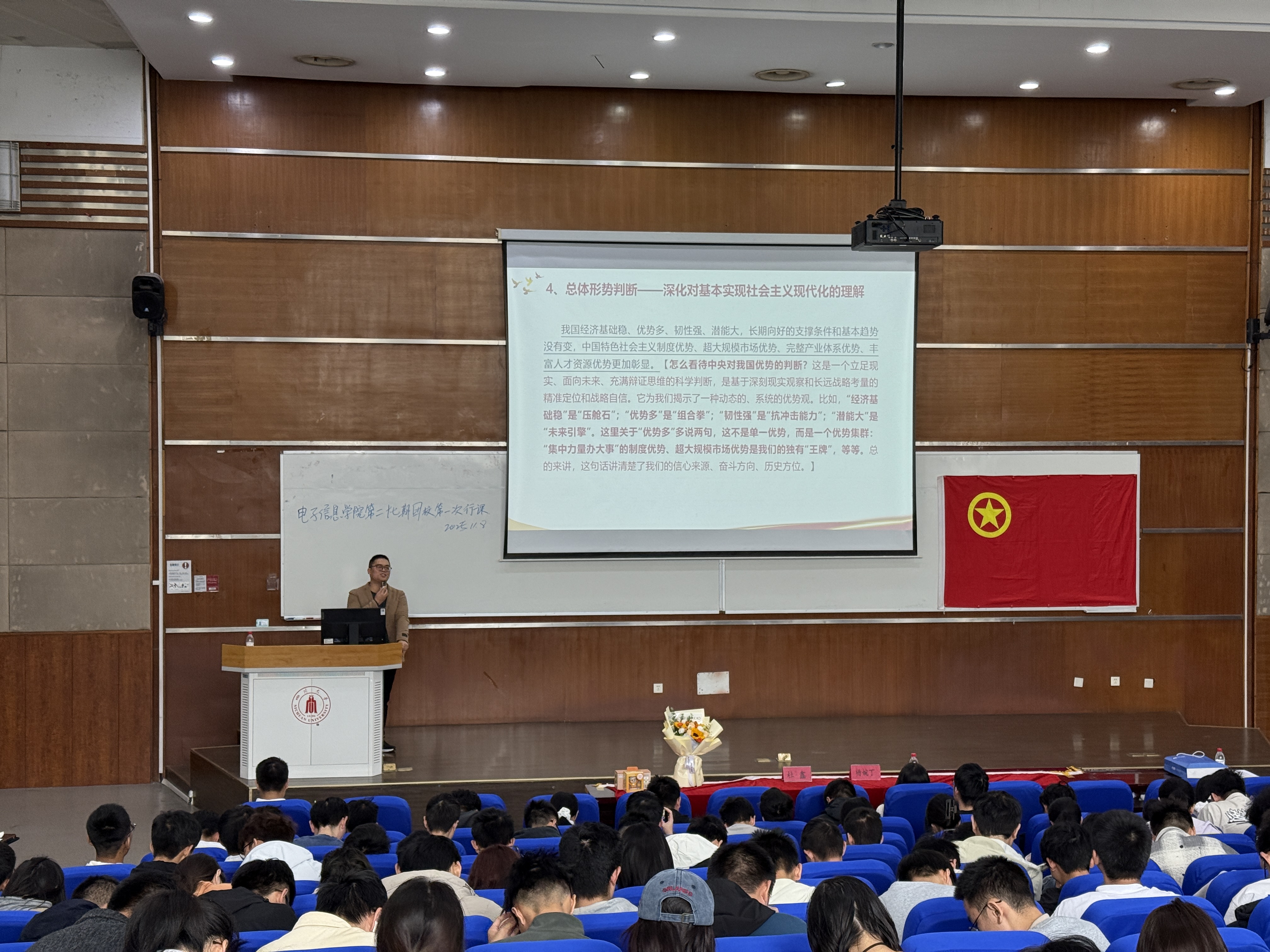 接着,共青团中央“青年讲师团”讲师、四川新闻网传媒集团团委副书记杜鑫以“青春为中国式现代化挺膺担当”为主题讲解党的二十届四中全会精神,强调青年应主动关心国家大事,并鼓励学生制定个人五年计划,与国家发展同频共振,同时也强调科技创新、绿色转型领域的重要性,呼吁青年投身国家急需领域。