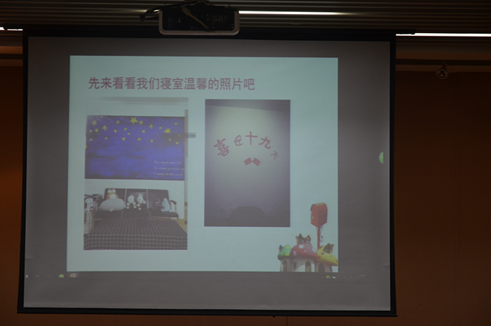 决赛中,各个寝室成员不仅制作了PPT来介绍寝室成员和寝室设计思路,还带来了精彩的才艺表演,有些寝室成员用笛子吹奏陕北民歌《山丹丹花开红艳艳》,有些寝室成员一起上台,共同演唱了精心准备的寝室之歌,有些寝室还录制了视频来补充介绍,可见同学们对此次活动非常重视。同时,上台展示的各寝室成员都毫不怯场,为了迎接即将到来的“十九大”,同学们在装扮寝室时融入了许多与“十九大”相关的元素,有认真创作的“十九大”诗歌,有精心制作的“十九大”主题海报,也有同学把自己崇敬的中国军人照片挂在寝室里,
