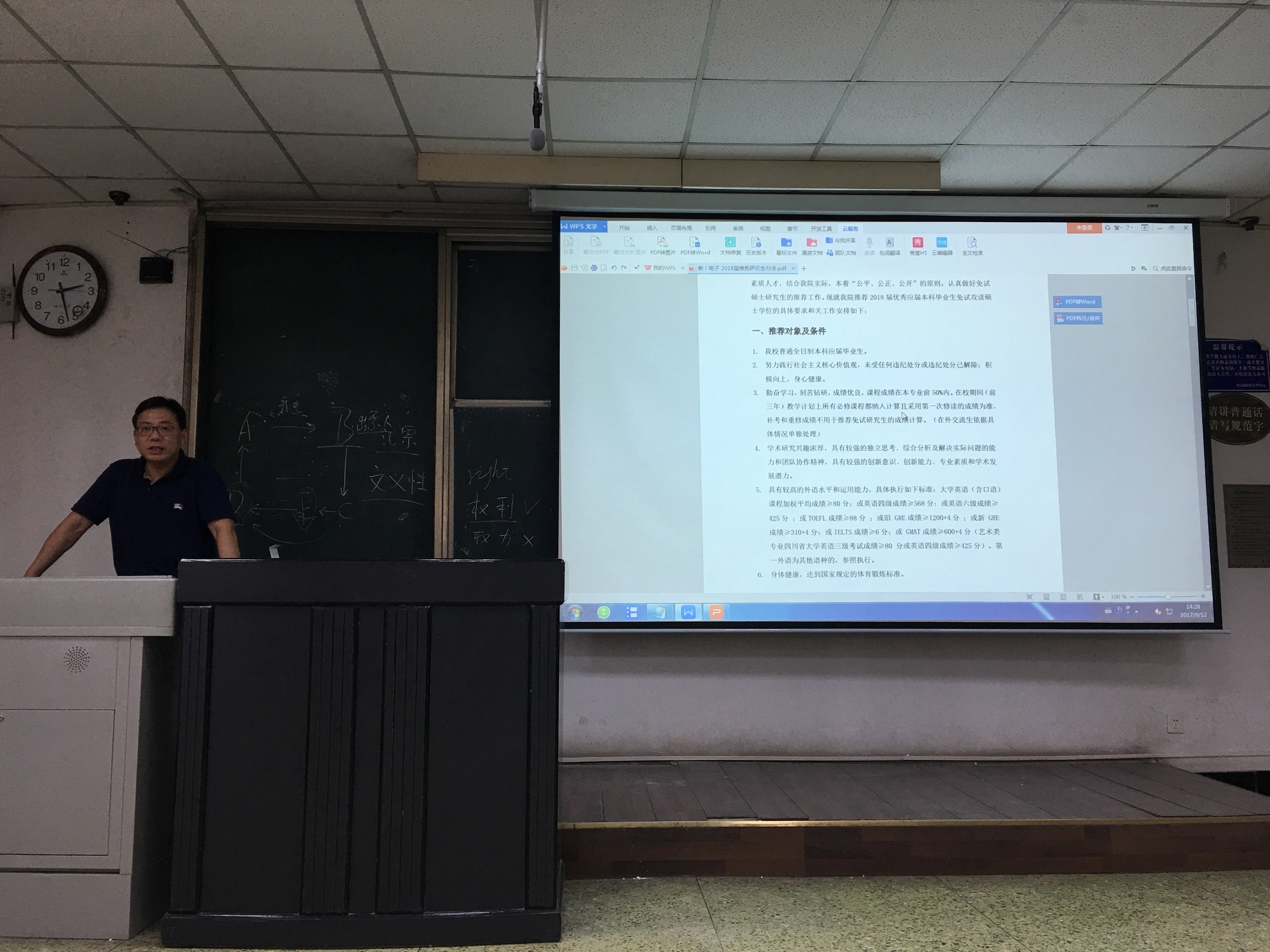 2018届推免研究生方法。介绍完毕后,周院长向大家公示了今年学院内各个专业的保研名额,总共75个,同比于去年有小幅度增长。之后陈书记对周院长的介绍进行更为详细的补充与说明,并呼吁同学们能够积极参与到学院的推免保研工作之中,能在名单公示期间对学院保研工作的推进进行关注与监督,同时,陈书记也对大家的优秀表示了肯定。最后,同学们就自身对于推免保研的一些问题向陈书记进行了提问与咨询。下午3点半,推免研究生动员会顺利结束。