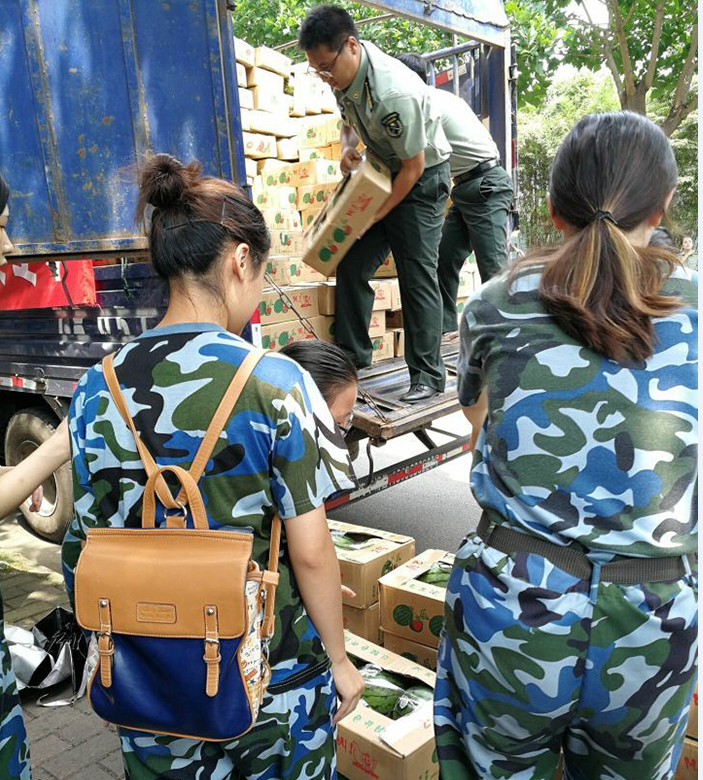 男生带队老师张弘老师、女生带队老师2016级辅导员陈晓娟老师,根据军训期间对本院学生身体状况的调查和了解,有序组织了军训防暑水果的分发工作。陈晓娟老师在此之前一直联系相关人员,及时向同学们告知最新动态,确保同学们在第一时间拿到防暑水果;张弘老师组织男生搬运水果,全程亲力亲为,直到将水果全部分发出去。在男女团负责人组织各位同学以寝室为单位统一领取后,各寝室长再向每人分发一个西瓜和一个梨。在此期间,同学们互帮互助,每位同学有序领取,充分体现了a漫