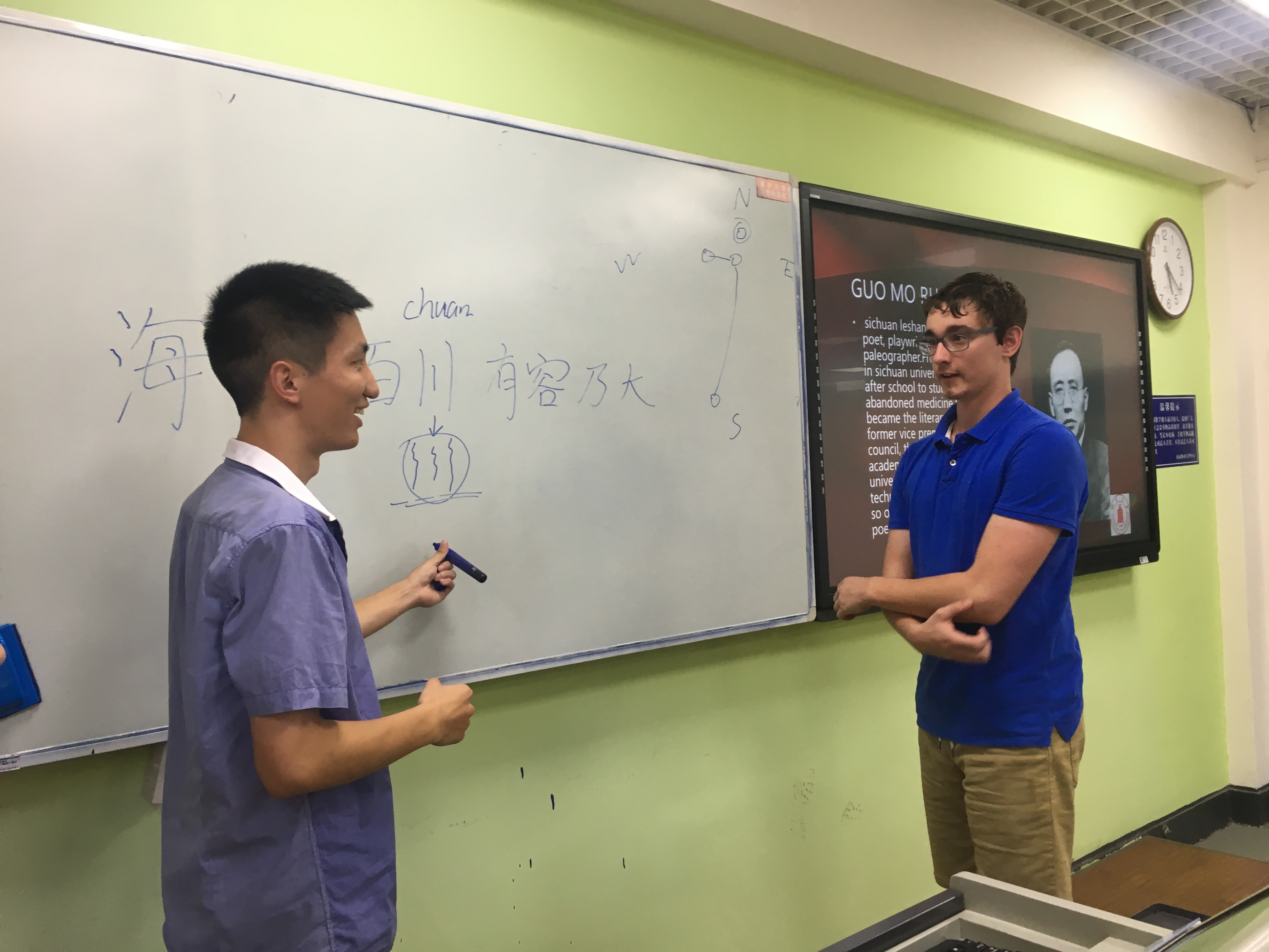 同学开始介绍川大杰出校友,详细讲述了巴金、朱德和郭沫若三位校友的生平与贡献,还请外国友人上台来写“四川”两个字。介绍川大部分结束,下面由a漫