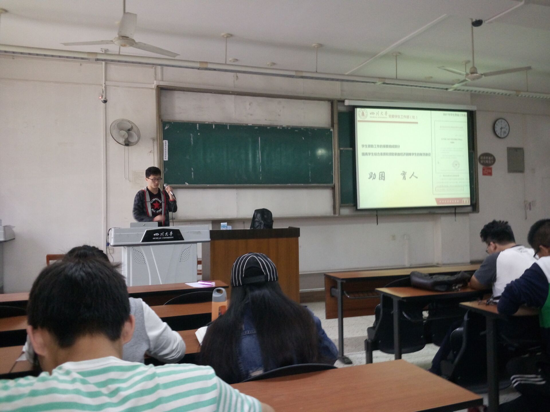 2015级在江安一教B101开展“诚信资助”为主题的宣讲活动。阳光资助宣传员张嘉伦为同学们讲解。讲解分为四个部分:1.勤工助学的诚信问题;2.奖助学金评定中的诚信问题;3.大学生以及社会中的征信问题;4.调查问卷的填写与收取。