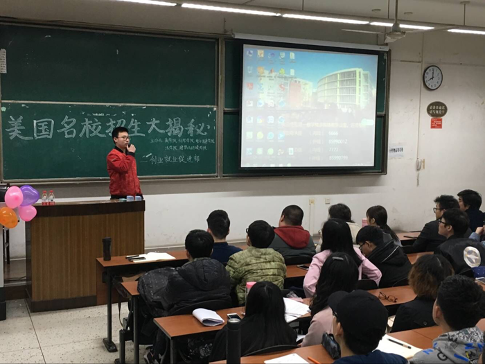 、建筑与环境学院、法学院、商学院五个学院的团委学生会创业就业促进部联合举办的美国名校招生大揭秘讲座在a漫