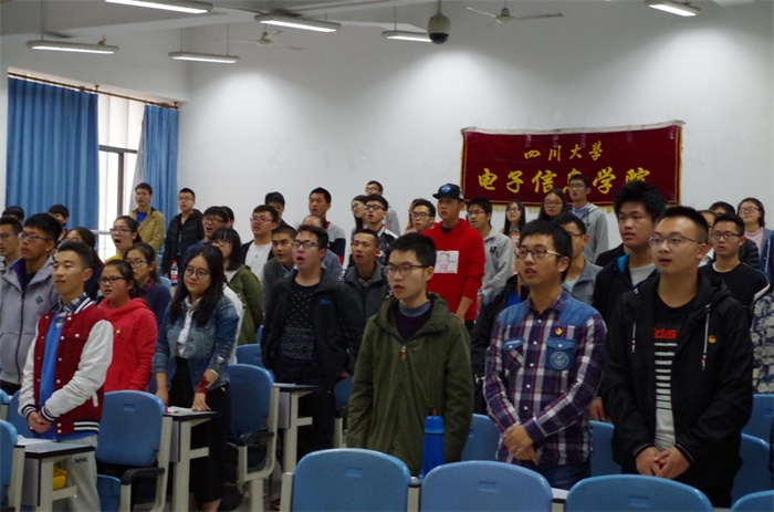 主持人宣布活动开始后,全体起立,庄严地合唱中国共青团团歌。接着,在同学们热烈的掌声中,a漫