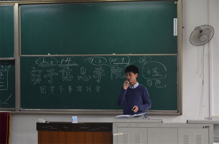 学生团委副主席姜越同学发表演说,他主要阐明了“谦逊”与“责任”的重要性,并引用拿破仑的“我来,我看,我征服”来提出经历的重要性,希望各干事能在加入团学期间,得到提升与收获。然后,副主席杨斯涵同学为大家讲解了电子团委学生会章程、制度与评分细则,并要求干事们严格遵守各规章制度。她还通过一组漫画来教予大家去相信自己,去看淡利益,去珍惜自己的工作。接着,由办公室副部长冯丹阳同学给大家讲解了关于写策划书的要求,使同学们对其有了全面和详细的了解。然后,由宣传部副部长牛通同学和黄璞同学分别给大家讲解了关于写新闻稿与微信推送的一些要求。最后,由主席王泽澎同学总结发言。他提出了时间合理安排分配的重要性,再次强调“专注”、“谦卑”与“勤勉”,并希望各干事牢记各部门的要求,互相加强交流与合作,为团学的更好发展做努力。