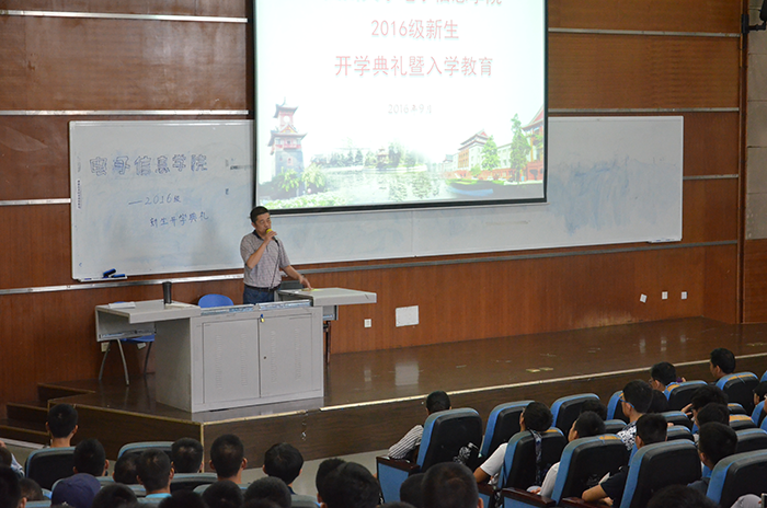 下午两点,在陈晓娟老师的主持下入学典礼正式开始。首先,由蒋书记上台讲话。他向同学们介绍了学院的一些情况并鼓励同学们抓住机遇做创新型人才。然后他结合新生的实际情况从心理、情感、人际关系的处理等方面出发为新生们提出了详细的建议。蒋书记的一番话拨开了新生们心头的迷雾,使他们更加了解如何处理好从中学生到大学生身份转变的问题。之后,2016级学生周雨婷作为新生代表结合自己对大学的初步了解做了演讲,鼓励同学们以极大的热情对待自己的大学生活。接着,周院长向同学们详细介绍了a漫