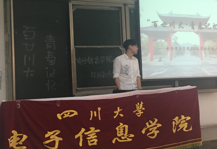 比赛在主持人郭力达同学介绍川大历史与本次活动目的中揭开序幕。其次,由各班抽签决定视频播放的顺序。紧接着,依次播放每个班级精心制作的视频。在播放视频的过程中,伴随着毕业季歌曲的旋律一帧帧图片在投影幕上跳动,每一个同学的出境都有属于自己的风格,在这四年的川大时光里,都有笑过,哭过,疯狂过,后悔过,感动过……在播放完九个班级的视频之后,由老师和学生评委打分,最后由光信7班和8班获得一等奖,信息安全9班获得二等奖,卓越10班获得三等奖。最后本次活动在一片掌声中结束。