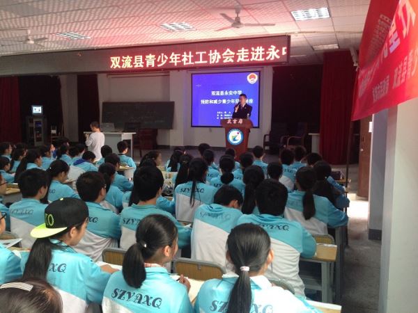 西南门集合出发,14时30分左右到达目的地双流中学永安校区。志愿者们协助老师布置好教室,等待同学们的到来。