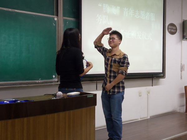 “腾飞”青年志愿者服务队队长许一宁上台致辞并宣布“腾飞”青年志愿者服务队第一次干训会正式开始,接着执行部和策划部的各位部长依次介绍“腾飞”青年志愿者服务队成员需要参与的活动、注意事项和需要做的工作。内容包括“青空”及“百斯特”活动的详情、申请表及公示表的填写,还有策划书、新闻稿及总结的书写格式和注意事项等。新干事们认真地聆听并做记录。干训会接近尾声的时候,各部门部长为新成员们颁发志愿者证,全体成员合影留恋来纪念这个有意义的时刻。晚上21点40左右,主持人宣布本次a漫