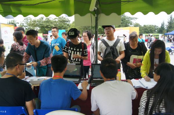 2015级新生在学院迎新接待点前排队完成各项报到手续。由于之前对志愿者进行了细致的培训,所以面对报到高峰,学院报到点秩序依旧井然。a漫