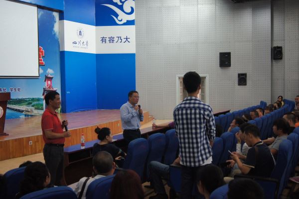 的科研能力、师资力量与学生培养情况,提出了三个“自我”的概念,即自我管理、自我学习、自我教育,表达了对新生未来的美好祝愿,也让学生家长对学院有了更为全面的了解。紧接着,周新志副院长就办学条件、学科建设、科学研究、学生人数及本科生培养模式等多个方面为新生及家长进行了十分详细的介绍。接下来由徐灿国老师介绍了学院的奖惩情况、安全制度,让家长对新生们的大学生活也更加放心。最后是现场的提问环节,由蒋书记、周院长等领导为众多家长答疑解惑。
