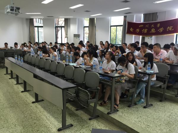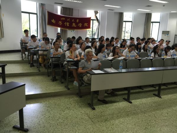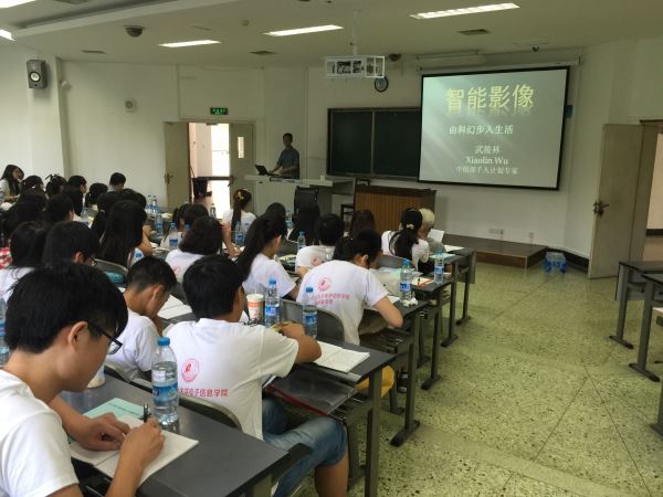 研究生院1-102教室开始。学院信息安全专业方勇教授首先通过几个简单生活细节向参营的同学们展示了信息安全就在我们身边,然后简单介绍了信息安全专业的学习情况;电磁场与无线电专业刘长军教授从电磁场的原理和应用以及电磁场与微波和无线电两个专业的学习生活情况做了详细的介绍;武筱林教授生动形象的将图像处理的简单方法和应用展示给大家,并且介绍了图像处理的发展现状和未来;讲座的最后,图像处理研究所的何小海教授就a漫