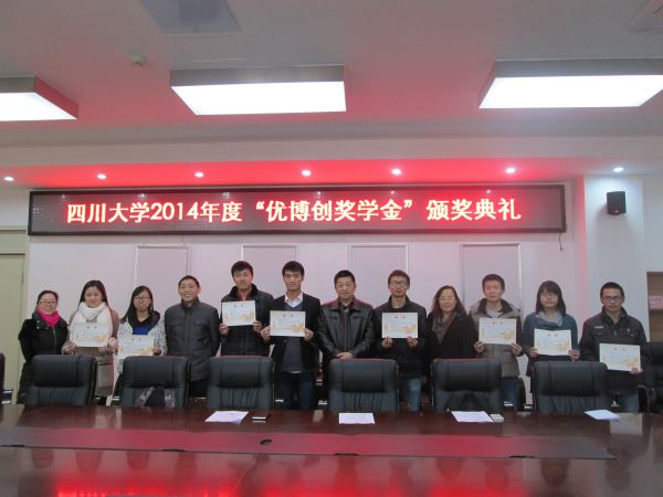设立的奖学金,旨在鼓励同学们认真学习、努力科研。本年度“优博创”奖学金的获得者为王梓祺、史晓荻、邱宗皓、吴小叶、谢云聪、全婷婷、陈满、顾晓华、翟迎亚、王迪十位同学。会议第二项,顾晓华同学代表所有获奖学生发表获奖感言。首先代表获奖学生对成都优博创公司表示感谢,然后表示一定不辜负成都优博创公司的期望,在学习上勇攀高峰。会议第三项,蒋斌书记总结发言。蒋斌书记对成都优博创公司表达了感谢之意,对获奖同学表达了祝贺之情。同时,鼓励同学们要努力探索知识的海洋,为中华民族的复兴而奋斗。最后,蒋斌书记、冯国英副院长、陈笃海副书记、何惠老师及李军华老师为获奖同学颁发了荣誉证书并合影留念。