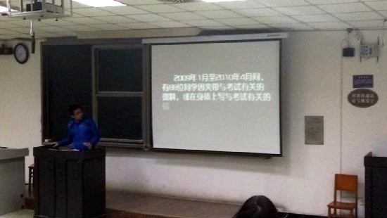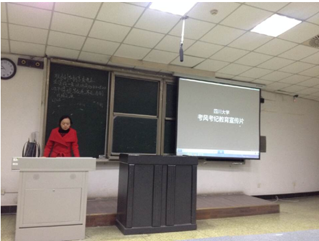 本科2012级,于2014年12月7日傍晚,在望江校区基教C101、C104分别召开2014秋“考风考纪”主题年级会。年级会的主题为:“诚信应考”。此次宣讲分别由本科2012级辅导员陈晓娟老师、研究生辅导员李军华老师主持。