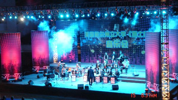 校党委副书记李向成教授的致辞后拉开序幕。音乐会包括“本土爵士乐演奏”和“原创爵士乐演奏”。爵士音乐交流会不仅体现在对本土爵士乐展现,还体现在对爵士乐的完美演唱上。全英文的演唱带给观众不同于中国歌曲的美好体验和惊喜。耳目一新的精彩演唱更是将整个演出推向了高潮。晚上9点30分,场上奏起了音乐会的尾声。然而在观众的热情期待下,主持人代表现场观众与乐队指挥进行了简短的沟通,爵士乐队返场加奏新的曲目。跳动的音符,舞动的旋律,传递着不同语言、不同文化间的国际友谊,体现出音乐无国界的伟大精神。