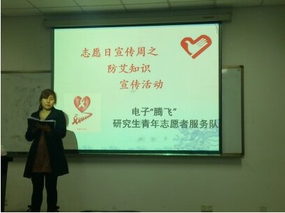 “腾飞”研究生青年志愿者服务队主办的“国际志愿者日宣传周之防艾知识宣传活动”在基础教学楼A303隆重举行。此次活动吸引了来自多个学院的同学积极参与。主持人李玉贞同学通过自己的志愿者亲身经历为同学们介绍了青年志愿者的相关发展现状,并为大家普及了预防艾滋病有关知识。其中问答环节中同学们广泛参与并踊跃回答了志愿者相关问题,活动气氛热烈。a漫