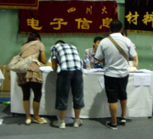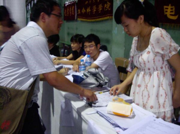 2011级研究生新生入学报到工作正式拉开帷幕。在望江体育馆风雨操场的一角,电子信息院研究生会工作人员仔细核对前来报到新生的录取通知书,指导新生进行签到、登记,然后发放新生入学手续传递单、新生入学指南以及研究生会招新表,并根据新生特殊情况发放培养费缓交申请表、新生不在学校住宿承诺书。告知新生入学报到注意事项,待新生完成全部的入学手续之后,验收新生入学手续传递单,并回收研究生会招新表。