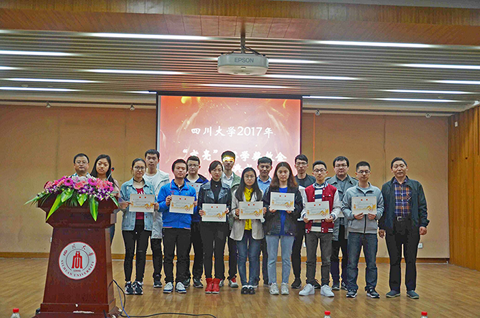 正式颁奖前,主持人陈笃海副书记首先带领大家清唱了国歌,全场气氛庄重。紧接着,他向在场的各位来宾介绍了本次颁奖典礼流程,让在场老师及同学对这次颁奖典礼有了更全面的认识。在接下来的颁奖环节中,伴随着激昂的音乐声,在场嘉宾为获奖者颁奖,获奖者手持奖状,和嘉宾一同合影留念。本次获奖的老师和同学均为a漫