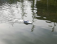 上午短暂的时光匆匆而过,迎来的将是下午激烈的角逐。下午2:00,比赛正式开始。一声哨响,第一只船出发了。在选手小心谨慎的操控下,船或者加速前行,或者减速拐弯,途中还要绕过四个浮标。评分人员根据船完成比赛所用时间,中途碰撞、超出区域的次数进行打分。紧接着,按照排序,一只只船开始了自己的航行。在这场激烈的比赛中,一些船脱颖而出,不仅美观个性,而且参赛中加速减速,流畅顺利,浮标岸壁,一次未碰,赢得大家一致称赞,拍手叫好。一些船,虽然在中途有一些小碰撞,但在小心操控下,也顺利地完成了比赛。当然,也有一些突发状况。一些船体在参赛前出现了故障,需要临时修改,便不得不延迟参赛;一些船在参赛中意外沉水,或者静止不动,同学们便及时帮忙打捞;而有的船因为马力过大,不受控制,冲向岸边。面对这些突发状况,同学们虽然显得有些焦急,但也在有条不紊的改进着自己的船,高效地解决问题,重新参赛。就这样,不知不觉,比赛进入尾声。