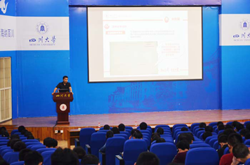 在陈林老师对新生们进行了简单的致辞之后,资助中心帕哈尔定老师上台发言。帕哈尔定老师代表学生资助中心向同学们介绍了学校资助政策。首先,老师就提到:学生资助不仅仅是资助,还有育人。接着,帕哈尔定老师向同学们介绍了资助的内容,其中包括:学生资助保障全覆盖,国家助学贷款,奖学金,助学金,困难补助,学费减免,学费补偿,贷款代偿及学费资助,医疗保险等方面。随后,帕老师讲了有关育人的内容。他介绍了学校的部分爱心公益社团,并举例说明了学校的部分主题教育活动。介绍完毕以后,老师留下了学生资助中心、贷款办、勤工助学中心以及学工部地址和联系方式,以便有需求的同学们及时联系。会议的最后,帕哈尔定老师告诉大家:贫穷不可怕,有需要就申请助学金,不是急需就将机会让给更有需要的同学,不要觉得不好意思,不要因为拿了钱就觉得丢了自尊。整个会议过程中,同学们都认真聆听,并用手机记录下重要内容。