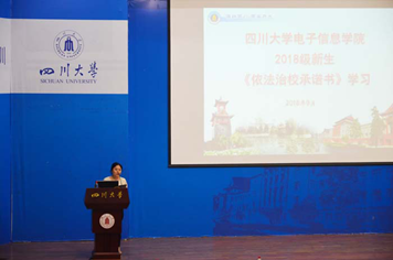 在此次宣讲会上,李钰凤老师给同学们讲述了依法治校的重要性,并告诉了学生应当怎么去遵纪守法。接着,陈老师给大家发放了学生承诺书,让大家从书面的形式学习诚信与法律,做一个优秀的川大人。最后,同学们都十分积极的响应,同时上交了承诺书。