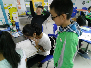 的志愿者从江安校区出发,骑车到达新街社区学生活动室。志愿者们以大哥哥大姐姐的姿态走进活动室,推门可见活动室的装饰妙趣横生,每一个书架,每一张贴画,都表现出了孩子们的纯真和小学生活的快乐。志愿者们和老师进行了简单问候之后,未等坐下,便有孩子拿着课本,礼貌地请求志愿者为其听写字词。(图1)中志愿者为小朋友听写,气氛和谐温馨。孩子们写完作业之后,陆续将自己的作业拿给志愿者们检查。(图2)中的姐姐在耐心批改作业并为小同学详细讲解。小朋友们写作业的时候,志愿者们就在活动室里轻轻走动,观察小朋友们的习题过程,并随时为小朋友们解答问题。在志愿者的讲解之后,小朋友都恍然大悟,露出欣喜的笑容。在和谐快乐的氛围之中,时间悄悄溜走,此次志愿活动在志愿者和小朋友的依依不舍中圆满结束。