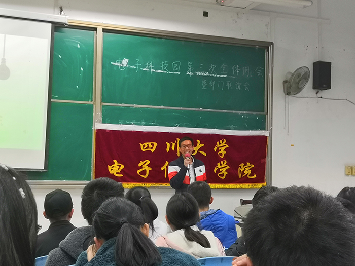 2018年11月25日,由电子科技园电子设计竞赛(第一组)、电子科技园电子设计竞赛(第二组)、电子科技园电子设计竞赛(第三组)、电子科技园电子设计竞赛(第四组)、电子科技园信息安全保密协会、电子科技园信息安全协会(第一组)、电子科技园信息安全协会(第二组)、电磁智能车协会、物联网实践与创新协会、网络技术协会举办的第三次例会在江安校区综合楼C座C303顺利进行。电子科技园主席团、部长团以及全体干事参与了此次例会。