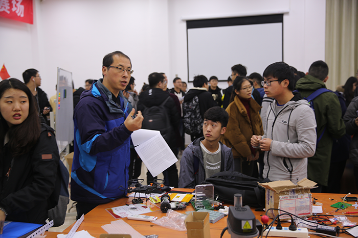 参赛队伍及所有评委按预定时间到达测试地点,比赛正式开始。两个类别作品的评测工作都井然有序地开展着,创意类参赛队伍派出代表,对小组研究成果作了详尽的ppt展示。作品类则直接向评审老师们展示成品,并解说自己的设计原理与作品功能。评委们也针对作品的优缺点做出了中肯的点评。