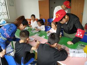 志愿者们在早上八点准时集合坐车并到达目的地新街社区。活动正式开始之前,志愿者们就开始进行充分的准备工作,过程中小朋友们也都陆续到达社区等待活动开始。活动正式开始后,志愿者们为每个小朋友发放了一份电子小手工的制作图纸并让他们自己研究,而志愿者只在旁边提供帮助指导,让小朋友们体会自己动手的快乐。看到小朋友遇到问题和困难时,志愿者们就耐心指导。经过共同的努力后,小朋友们都完成了属于自己的小手工作品。看着自己的完成的作品,每个小朋友充满了成就感,在他们开心制作并玩耍的同时,志愿者们也收获了自己的快乐。