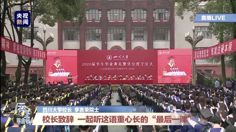 在望江校区隆重举行2020届学生毕业典礼暨学位授予仪式,本次典礼采取线下与线上同步直播的方式,共设了40个学院分会场,各院系领导及师生代表共赴云端、隔空祝福,共同见证了一场别有意味的青春加冕,这将成为2020届毕业生特别的青春印记。