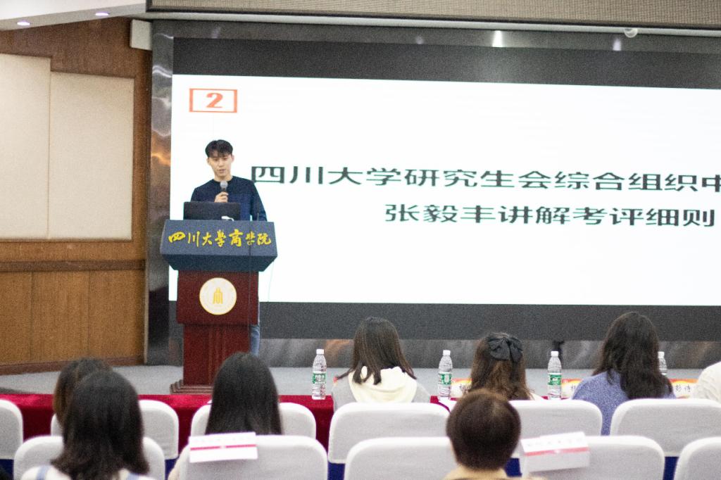 本次会议分为四个议程,依次是团委副书记、研究生会执行主席彭诗睿发表会议讲话;综合组织中心主任张毅丰对考核细则进行讲解;a漫