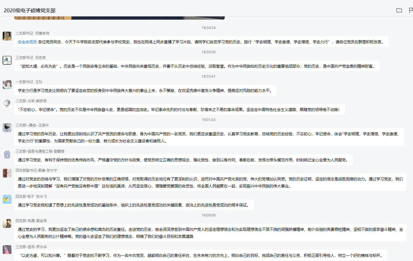 邀请到中央宣讲团成员、原中央党史研究室主任欧阳淞为我校进行党史学习教育集中培训专题辅导。2020级硕博第二党支部书记何惠老师组织年级全体研究生党员进行线上学习并交流学习心得。