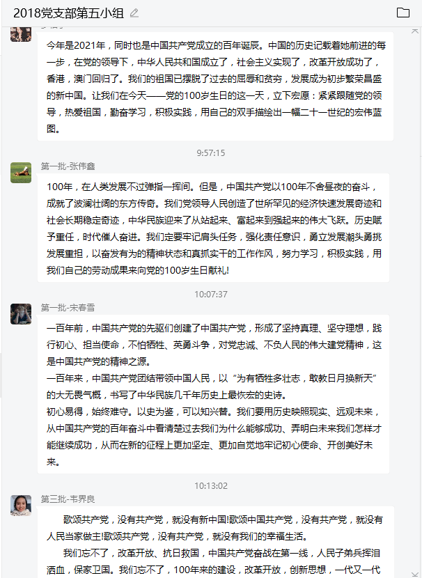 大会结束后,支部党员展开了交流讨论,热议观看大会的心得体会。连晨表示:“ 历史选择了中国共产党,作为新一代的青年共产党人,我们要继承前辈们的品质,将为人民服务的宗旨坚持到底,扛起新时代发展任务的重担。”