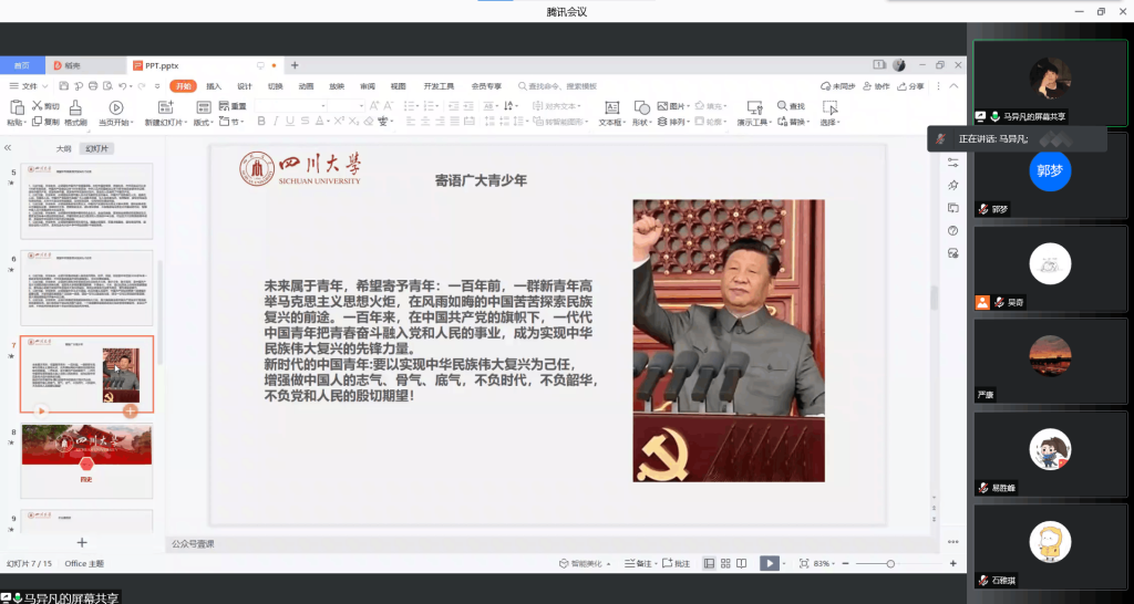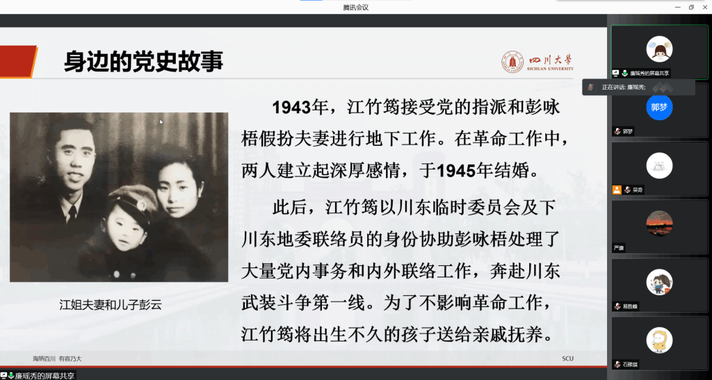 本次活动主要采取小组汇报的形式。各个组的同学结合习近平主席的七一讲话内容以及家国历史,通过具体事例,深入研读,真情讲述了关于党的故事,如江姐的革命事迹,并展望中华民族伟大复,表达了对党的敬佩。每个故事都令人感动,他们的精神感染着我们,我们也要将共产党人的崇高精神铭记在心,并传承下去。