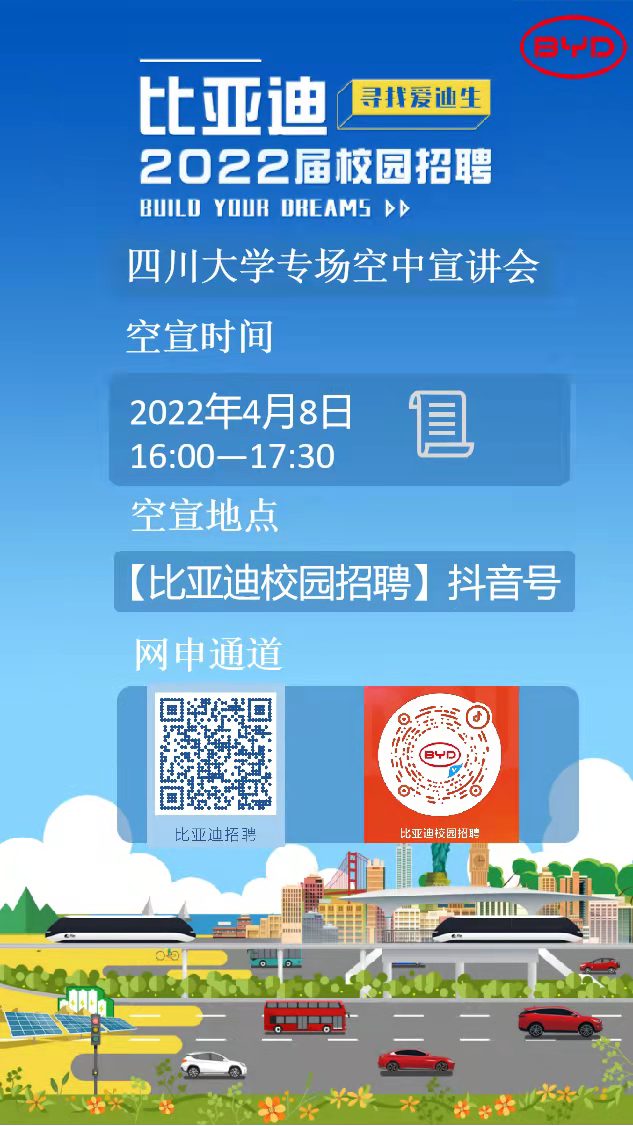 【比亚迪股份有限公司】2022春招线上宣讲会正式启动啦!学校:a漫 时间:2022/4/816:00-20:00宣讲形式:抖音关注“比亚迪校园招聘”简历投递方式:关注“比亚迪招聘”公众号 选择菜单-校园招聘-简历投递简历投递邮箱:[email protected]联系电话:18846770194工作地点:全国城市任选欢迎各位呼朋唤友来参加哈