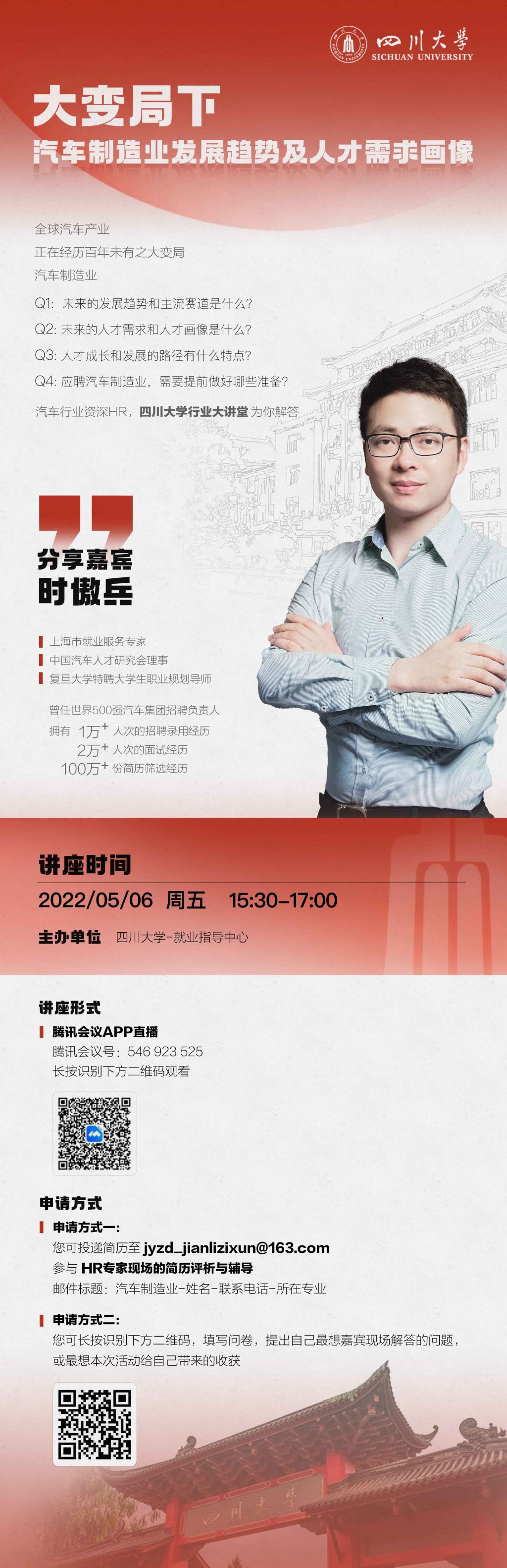 5月6日(周五)我们将开展a漫 行业大讲堂之汽车制造业发展趋势及人才需求画像,特别邀请了汽车行业资深HR、中国汽车人才研究会理事时傲兵为大家进行线上分享,请对同学们进行广泛宣传,大家积极参加了解。