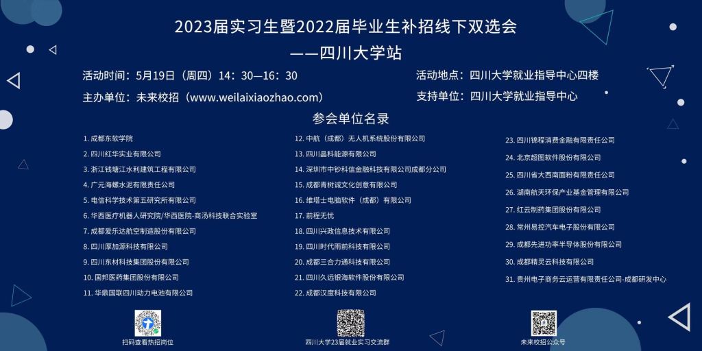 现场双选 | 5月19日 | 2023届实习生暨2022届毕业生补招线下双选会—a漫 ⏰时间:2022年5月19日(周四)14:30—16:30 📍地点:a漫 就业指导中心四楼欢迎加qq群了解更多:742717438
