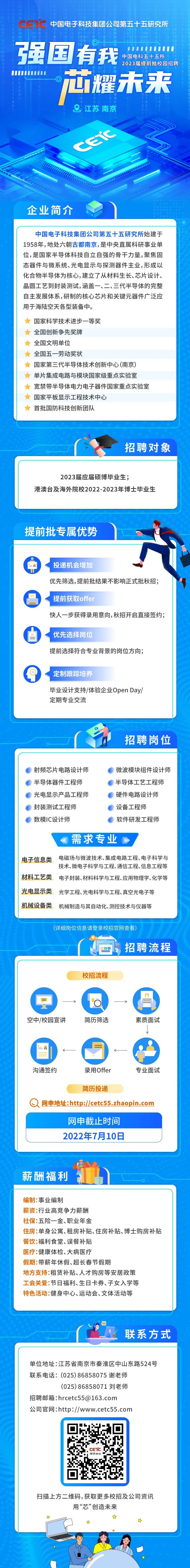 中国电科第五十五研究所2023届校招提前批宣讲宣讲时间:6月23日晚上6点30分宣讲地点:基础教学楼A308专属优势:1、现场收取简历,时间允许当天面试;2、简历筛选专属通道,快人一步获取offer;3、多一次投递机会,结果不影响秋招;4、面试通过优先选择岗位,获取暑期实践机会。欢迎同学踊跃参加,一起用芯创造未来!