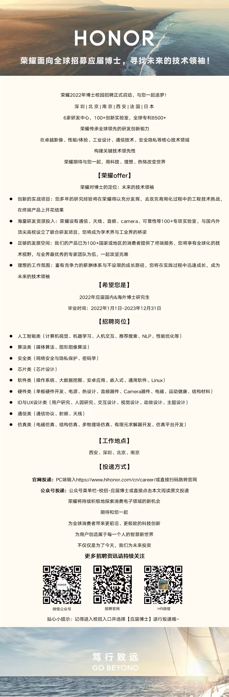 荣耀招聘博士,22年1月到23年12月毕业的都在今年招聘范围内,博士如果感兴趣可以投,博士招募海报如下: