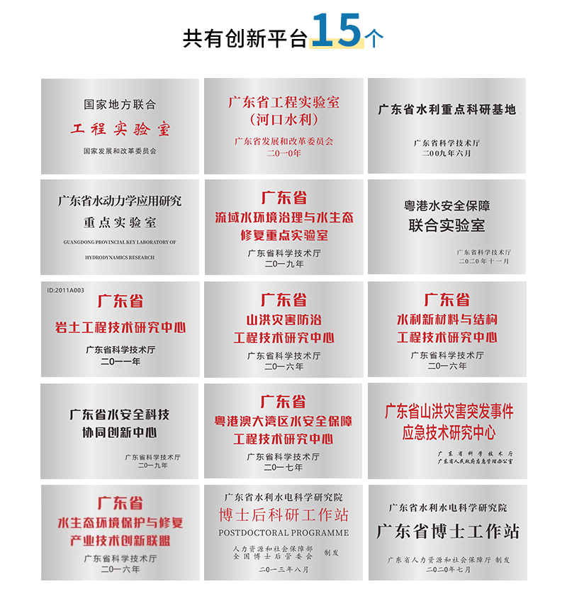岩土工程研究所、结构材料研究所、广东省水利建设工程质量与安全管理中心、水利工程管理研究中心、智慧水利研究所、水利智能感知研发中心、水利基础数据中心、广东水科院勘测设计院。