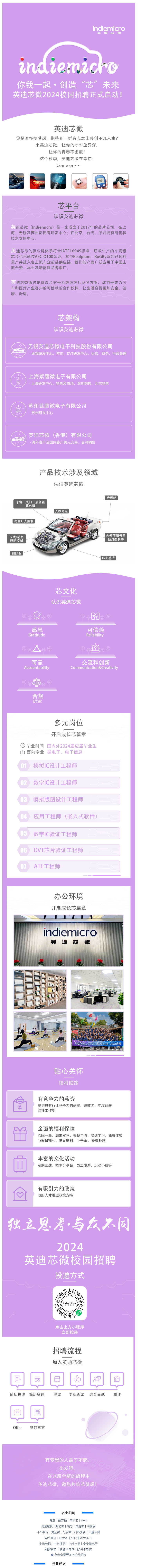 英迪芯微2024届校园招聘强势来袭!!关于英迪芯微国内领先的模数混合车规芯片方案供应商,在上海、无锡及苏州都拥有研发中心福利待遇:极具竞争力薪酬、绩效奖、年度调薪、弹性工作、六险一金、免费体检、餐饮补贴、下午茶、生日福利......招聘岗位:模拟、数字、版图、应用工程师、IC验证、DVT芯片验证、ATE工程师