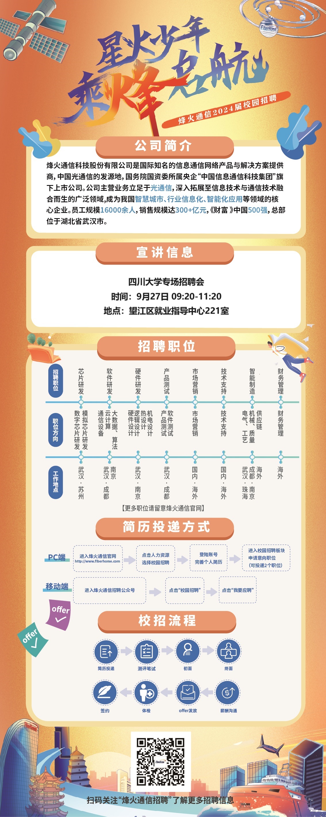 川大校友甲天下,很多川大毕业的校友在烽火通信承担国家核心关键项目的攻关或管理者角色,诚邀各位学弟学妹参加烽火通信宣讲会,加入烽火,为祖国的光通信事业做出自己的贡献!