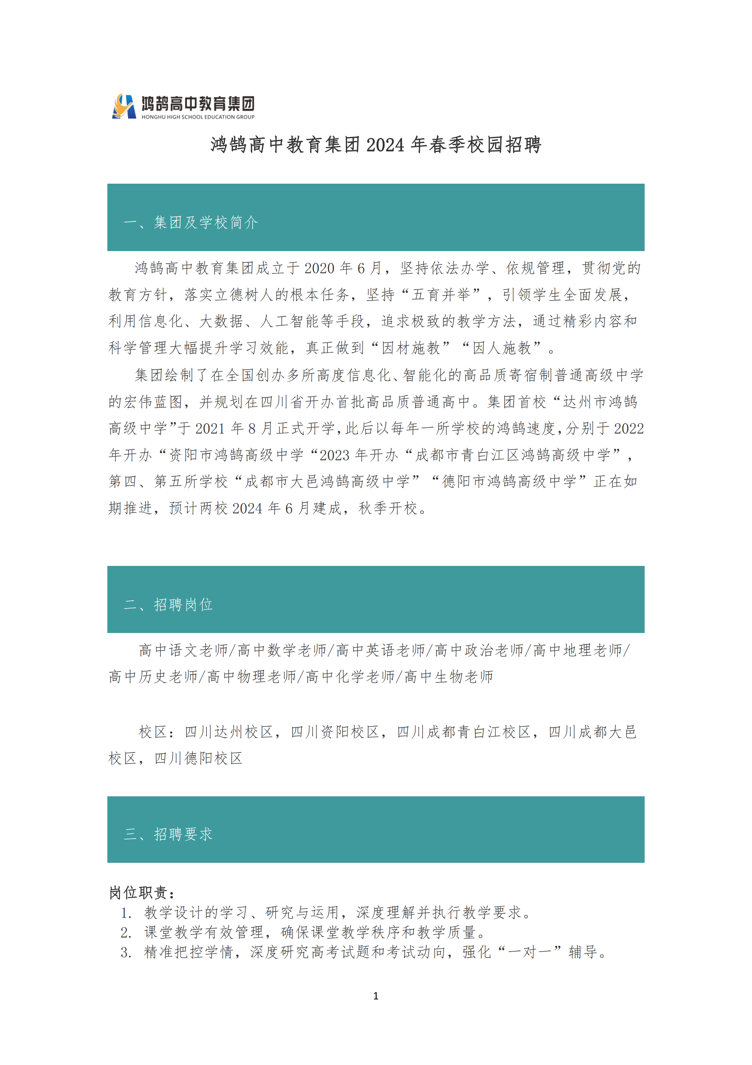 鸿鹄高中教育集团2024届校招