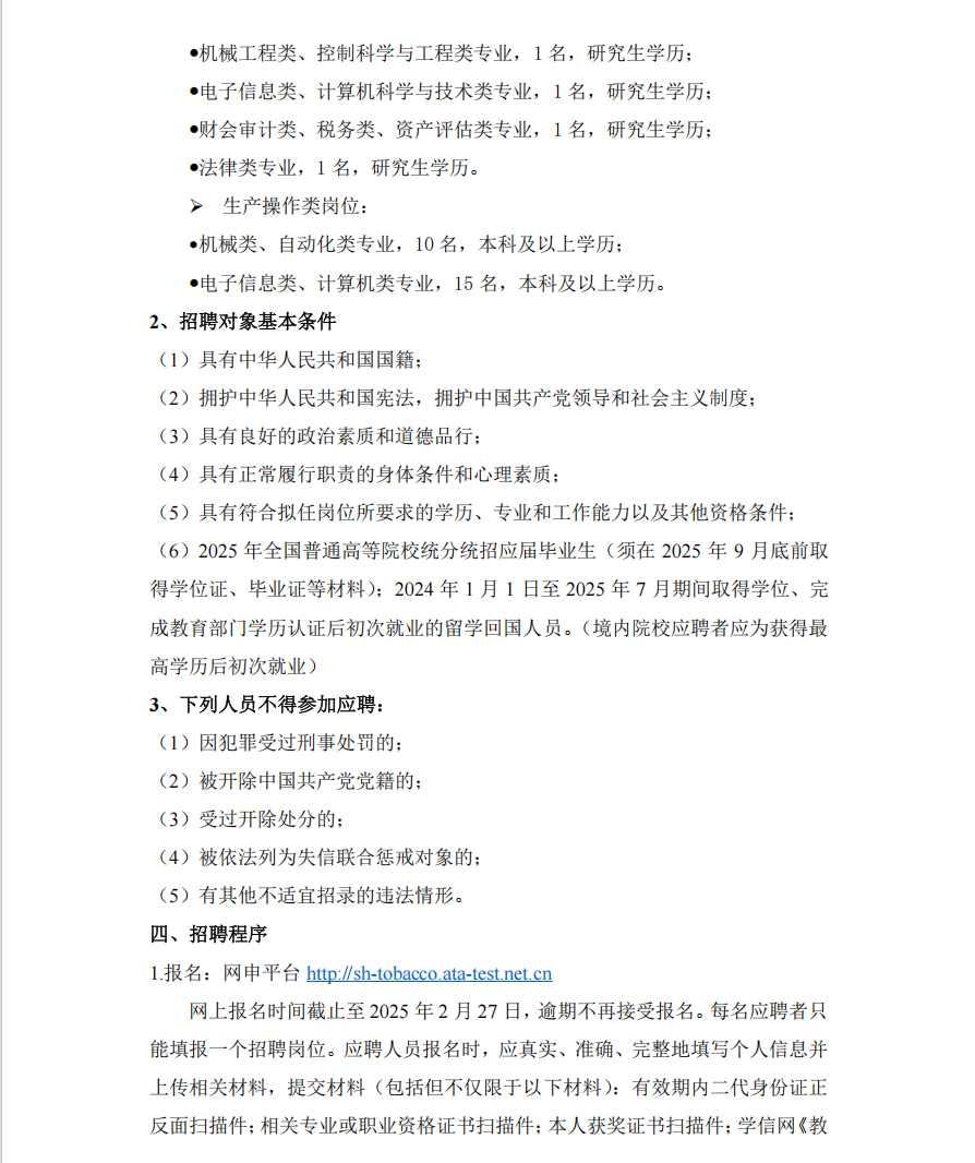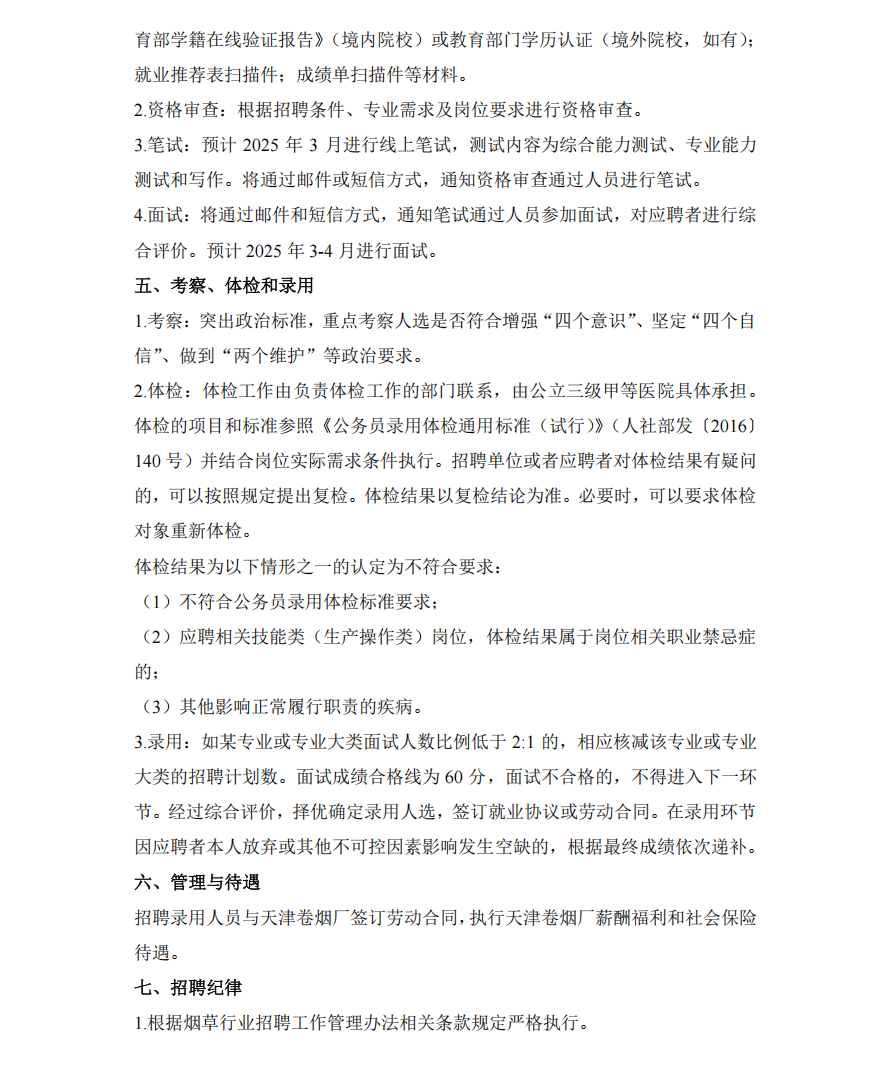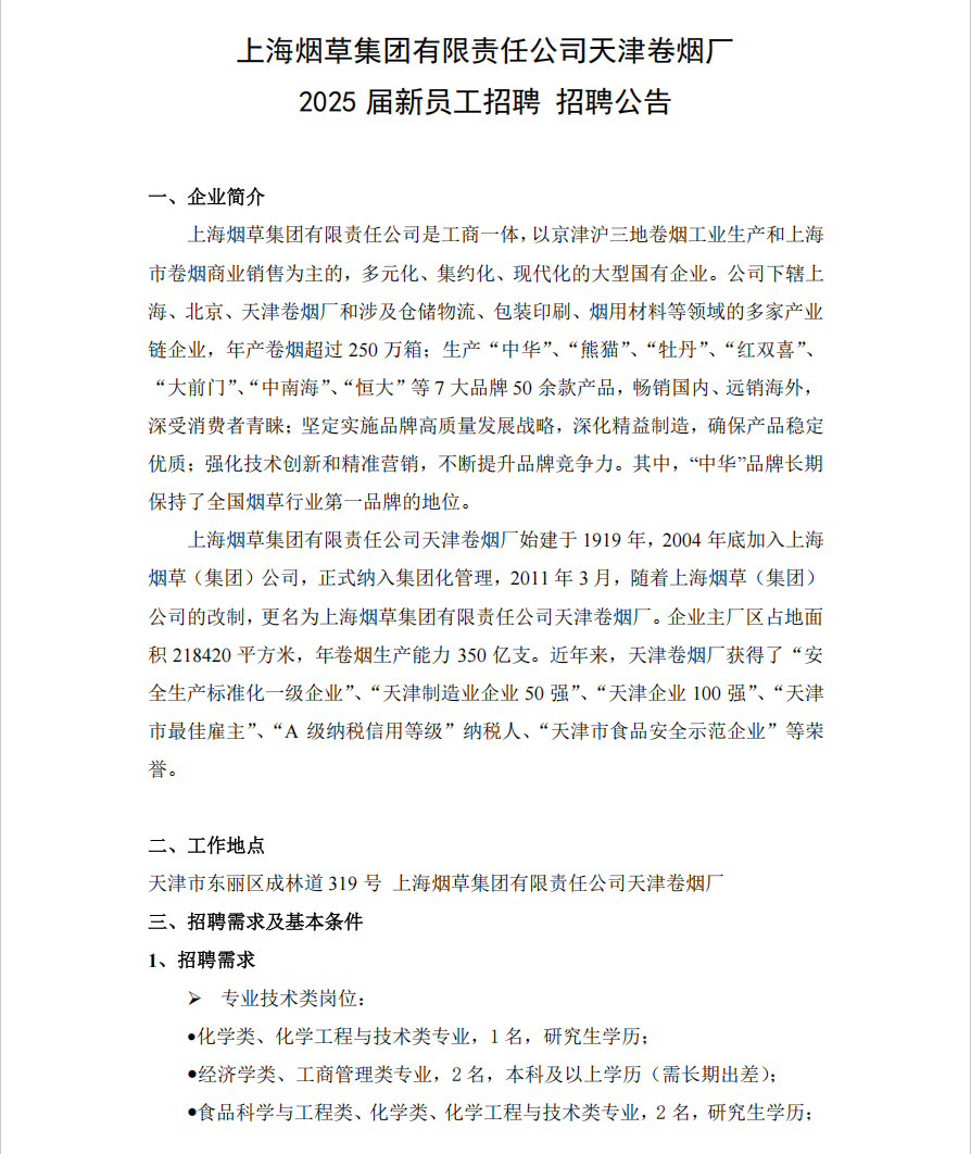 上海烟草集团有限责任公司天津卷烟厂2025届新员工招聘(报名截止时间为2月27日晚上12点前)