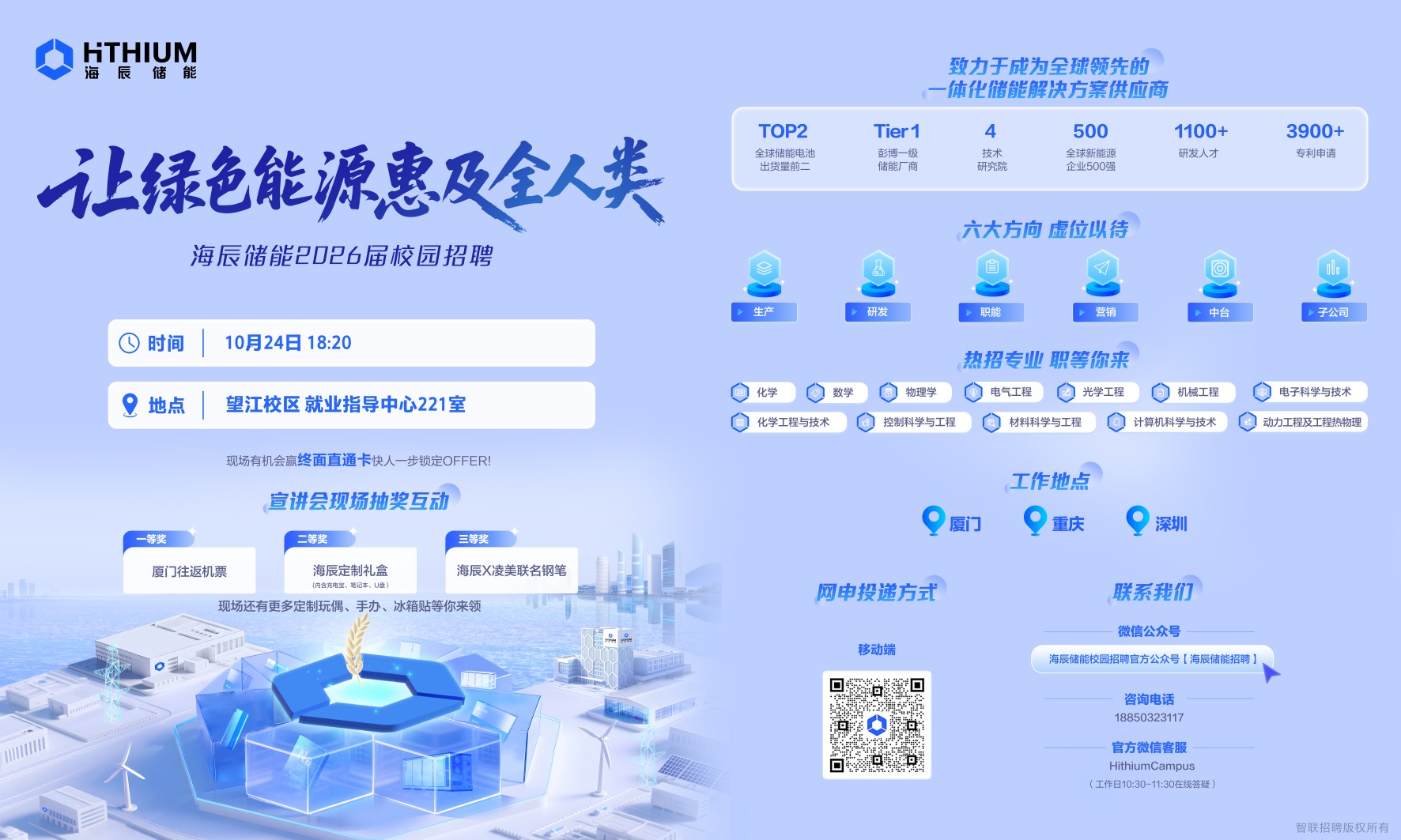 站海辰储能2026届校园招聘宣讲会。一站式了解海辰储能高潜赛道、企业福利、晋升通道!